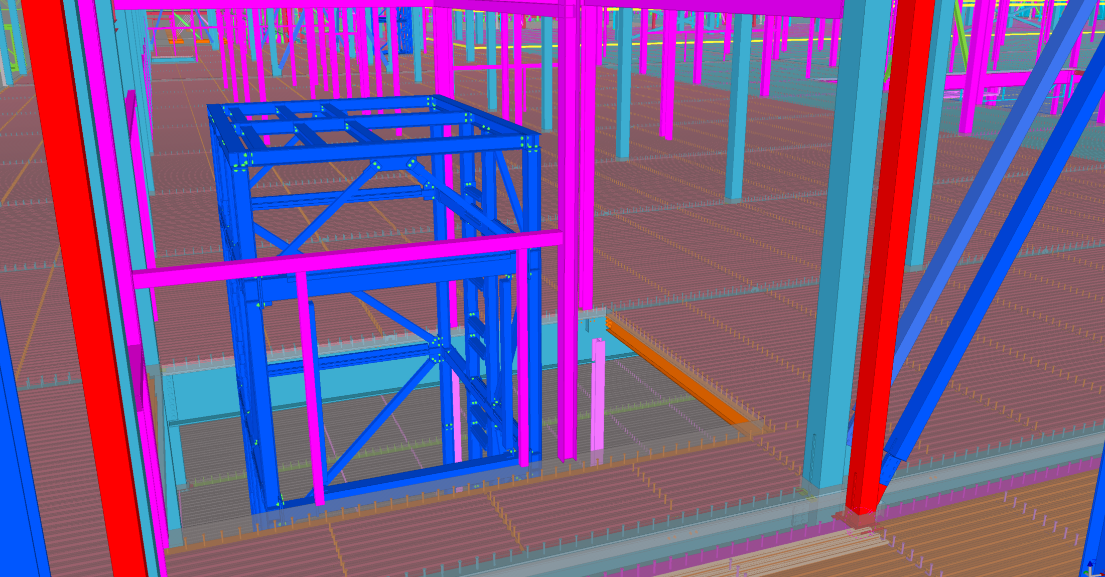 Dodatkowym wyzwaniem było zarządzanie licznymi otworami w stropach pod systemy technologiczne. Dzięki Tekla Structures możliwe było precyzyjne określenie „stref bezpiecznych” oraz jasne komunikowanie ograniczeń konstrukcyjnych wszystkim zespołom. Pozwoliło to chronić integralność konstrukcji, bez konieczności spowalniania tempa prac projektowych.
