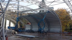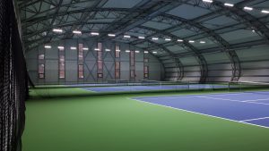 Projekt řeší nosné ocelové konstrukce novostavby tenisové haly. Tenisová hala má půdorysně tvar obdélníka o rozměrech zhruba 80x42m. Z konstrukčního hlediska je zastřešení haly tvořeno osmi obloukovými trojbokými vazníky výšky zhruba 1,4m a obloukovými nosníky ve štítových stěnách. Nosné konstrukce jsou rozmístěny v modulech 8,1m+7×8,9m+8,1m. Ocelová konstrukce mezipatra je situována podél osy B. Jedná se o jednopodlažní vestavek šířky 4,3 m a výšky horní hrany OK 3,44 m.