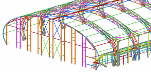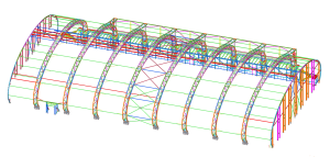The project deals with the proposal of new tennis hall steel structure. Ground plan dimensions are approximately 80 x 42 m, maximum height is +12,55 m. Structure is based on eight arched truss cross frames of about 1,4 m height and columns with beams in front and back walls. Main cross frames are with distance of 8,1 + 7 x 8,9 + 8,1 m. Along axis B is one store inhall situated of 4,3 m width and 3,44 m height. Main cross frames have triangular shape with one bottom and two upper chords. Bottom chord is proposed using tubular sections, top chords are from H shape welded sections for cladding panels fixing. In middle part is arched frame shape circular, on sides is oblique. Cross frame is anchored using pair of pin connections on each side, span between fixing points is 40,25 m.