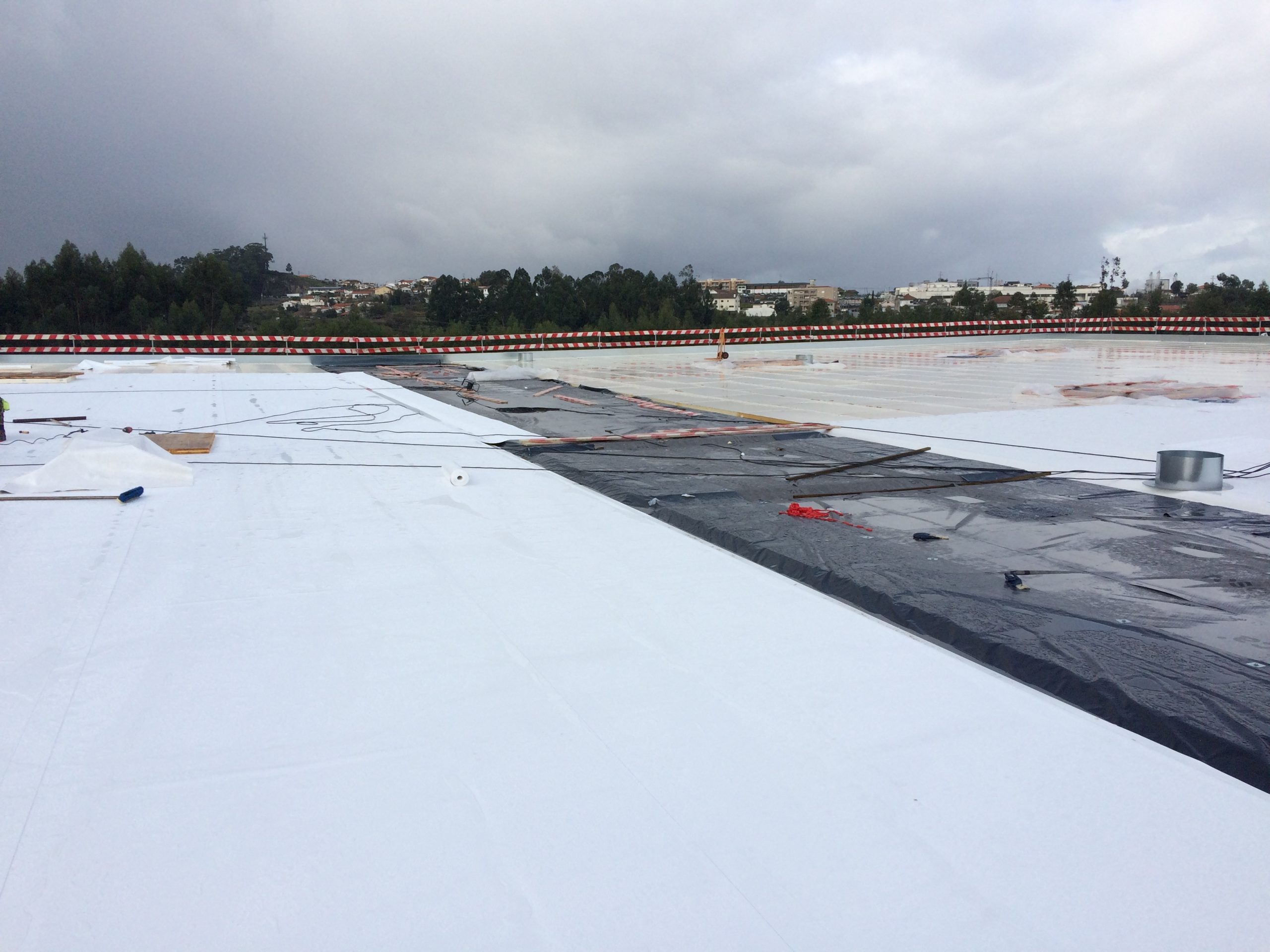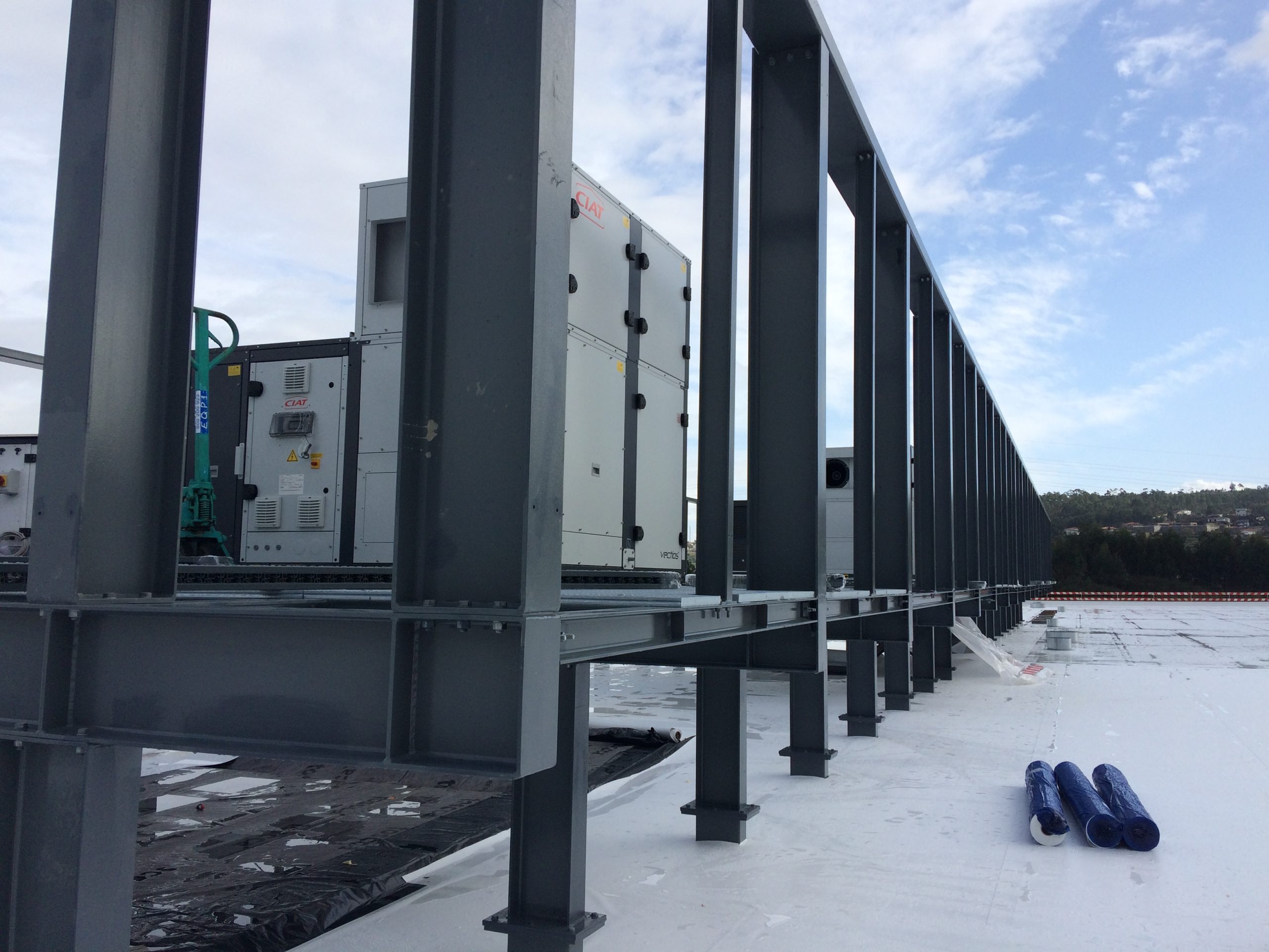 Concepção, fabrico e montagem de unidade fabril em Penafiel, com estrutura hibrida constituída por estrutura metálica e madeira, perfazendo uma área coberta de 7500m² (125m de comprimento por 60m de largura) com vão livre interior (2x) 30m, com pilares e secção central realizada em treliça espacial triangulares.