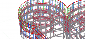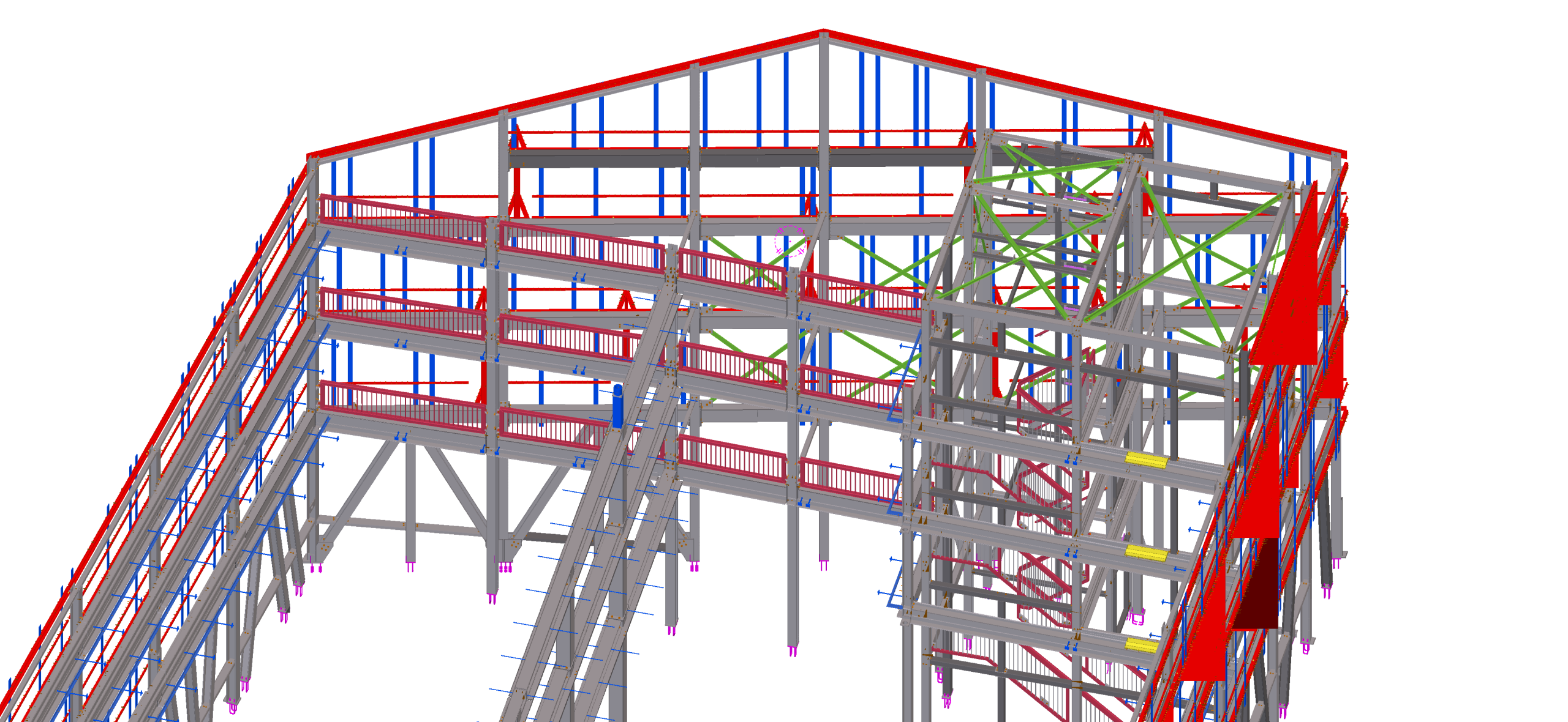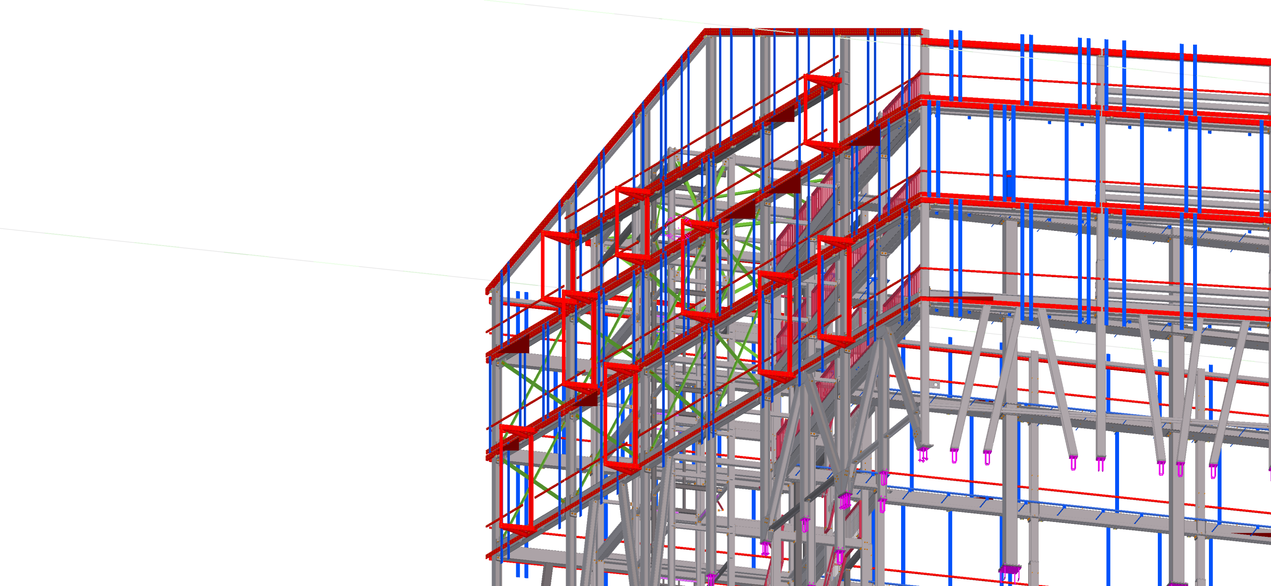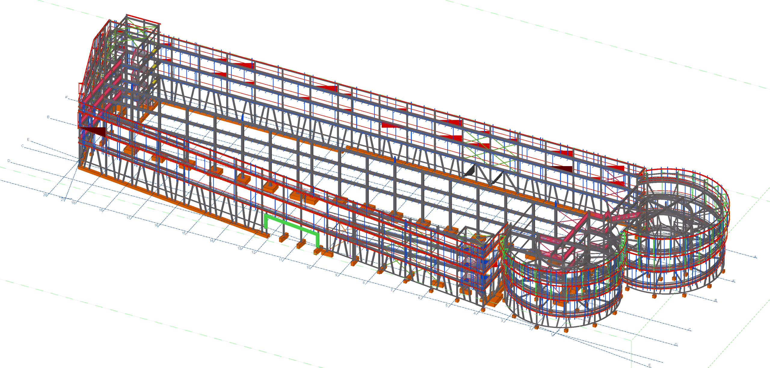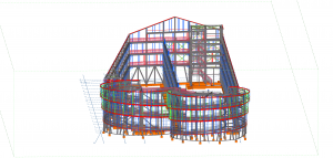 The steel structure for this project was detailed in Tekla Struktures 20.0. The challenge was the two round towers. The profiles for these towers are not easy to model. The end of each profile is twisted a little, the challenge was to keep it as close to the radius and slope as possible. Total structure is well over 440tons of steel. The parking lot holds 375 cars and over 600 bicycles. There are staircases, fences, elevators and thousands of holes for the connection of the wooden elements on the outside of the building. Each bolt in the outside of the towers is drawn one by one.
