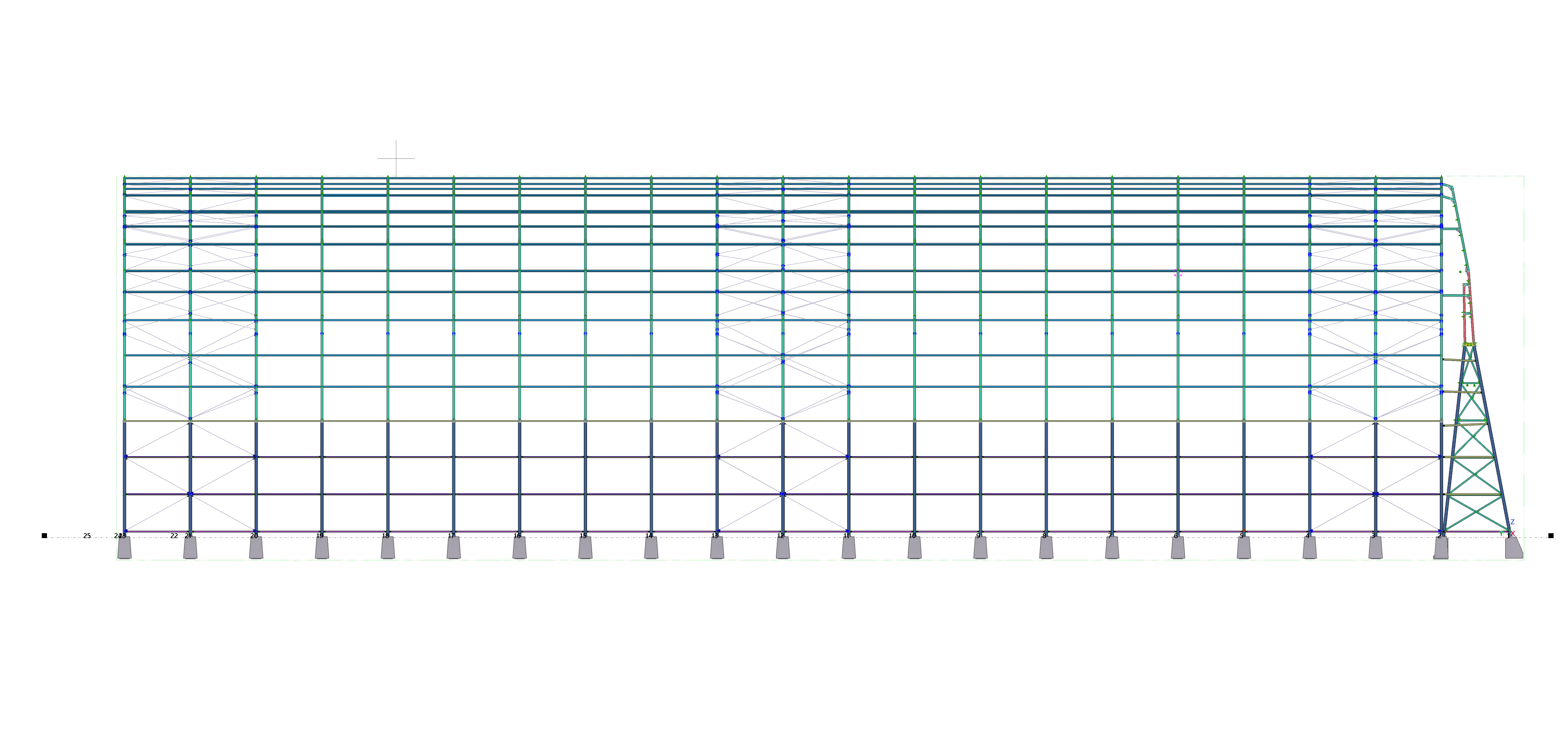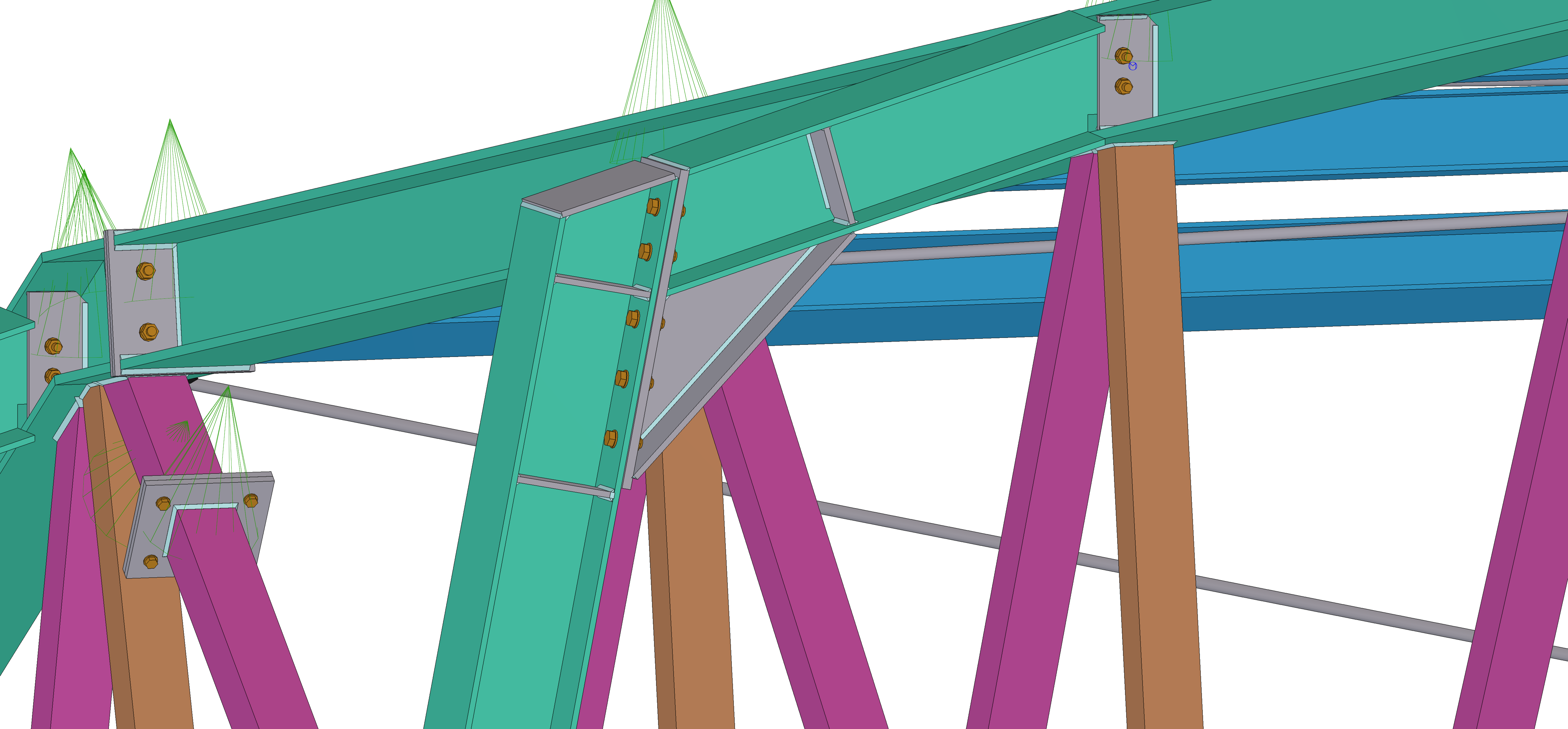 The main structural system is a two-part truss frame. The lower part of the structure, called the “trestle” consists of circular hollow sections CHS273.0x12.5 and a beam in the form of HEA280 section, on which the upper arched truss is supported. The upper arched truss is composed of lower chords made of HEA200 section, upper chords made of HEB220 section, while the diagonals and posts are made of square tubes with sections SHS100x4.5 and SHS100x6.3. The upper arched truss is divided into 8 independent segments connected end-to-end. The purlin beams (HEA140 sections) connected to the transverse frames are pinned using shear plates. The supporting columns of the structure are connected to the foundation bases as pinned supports.