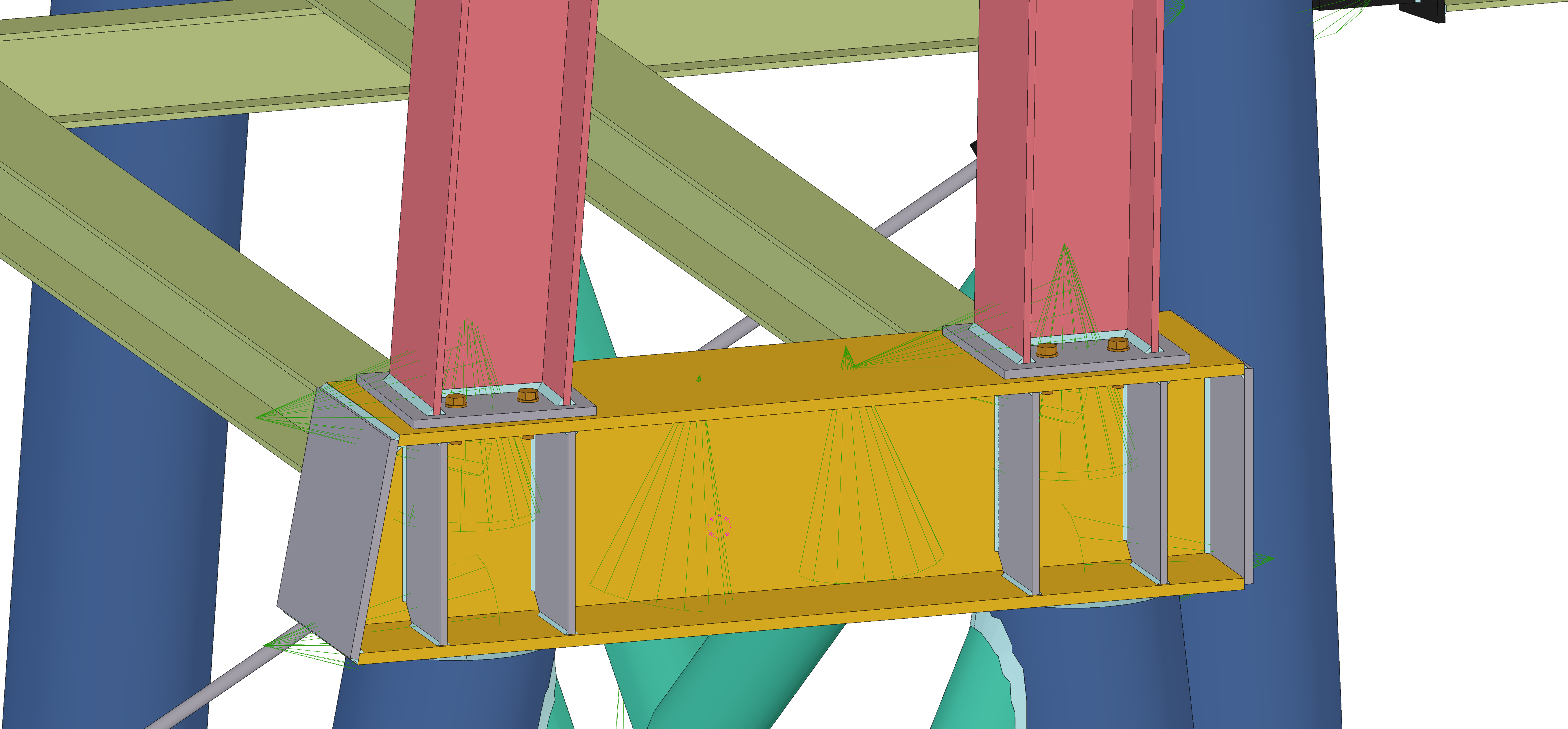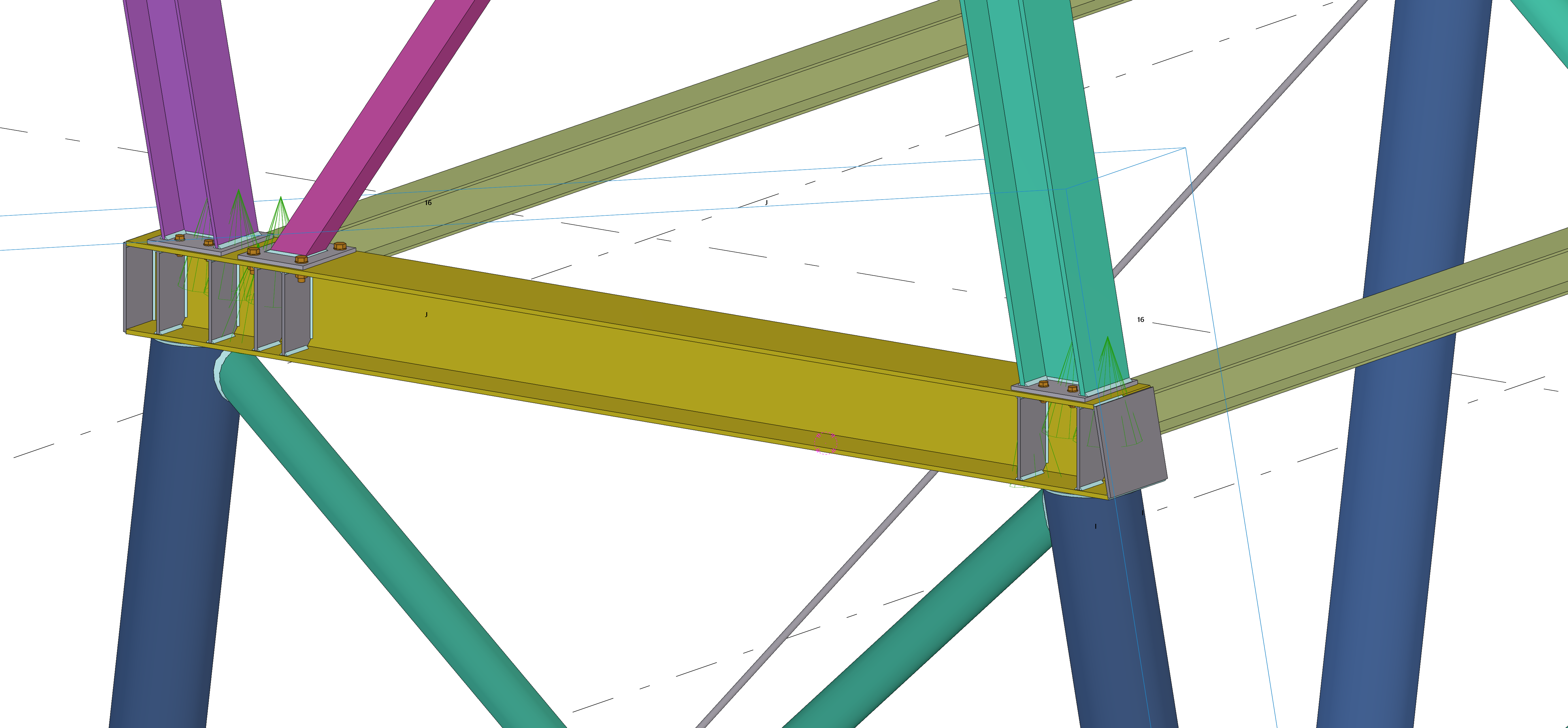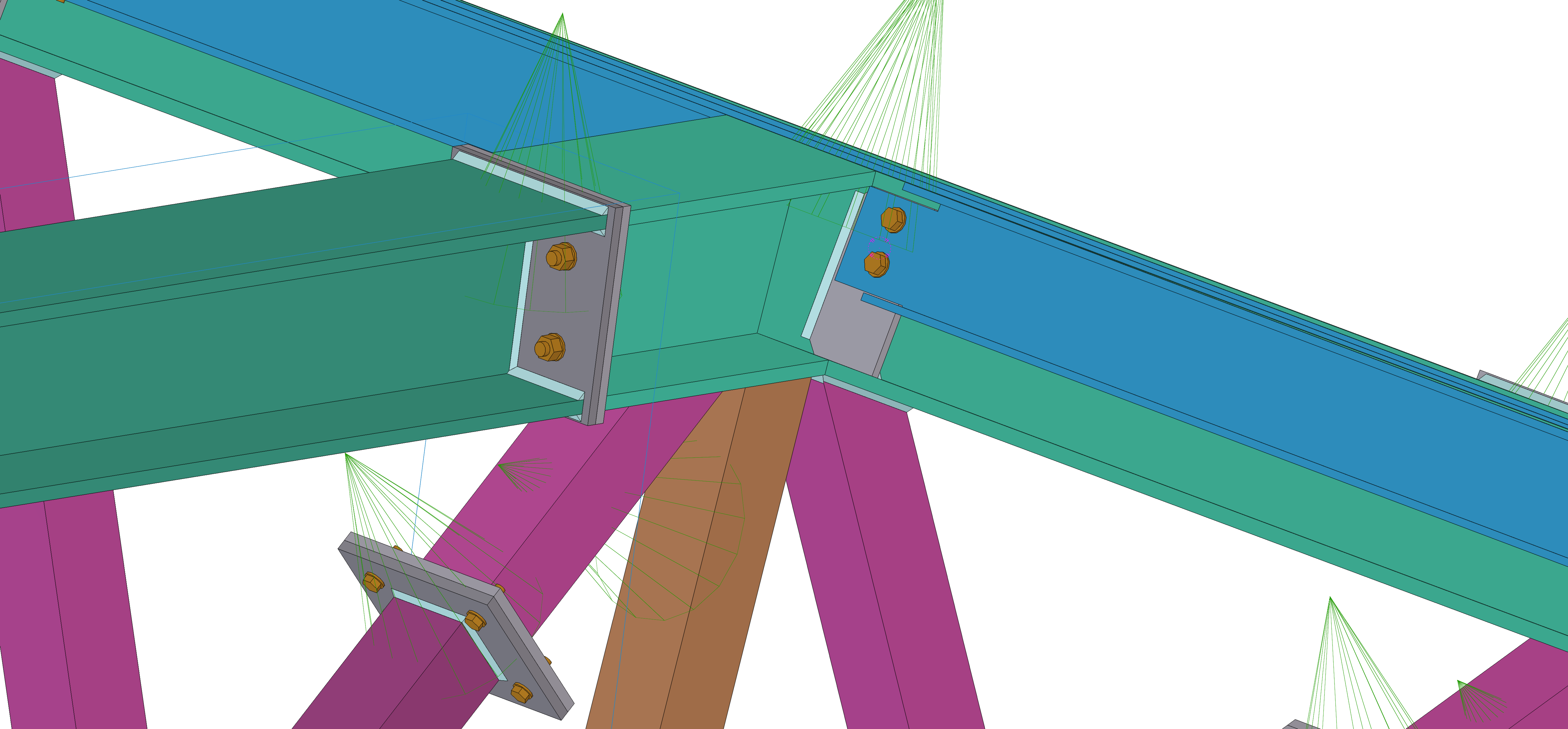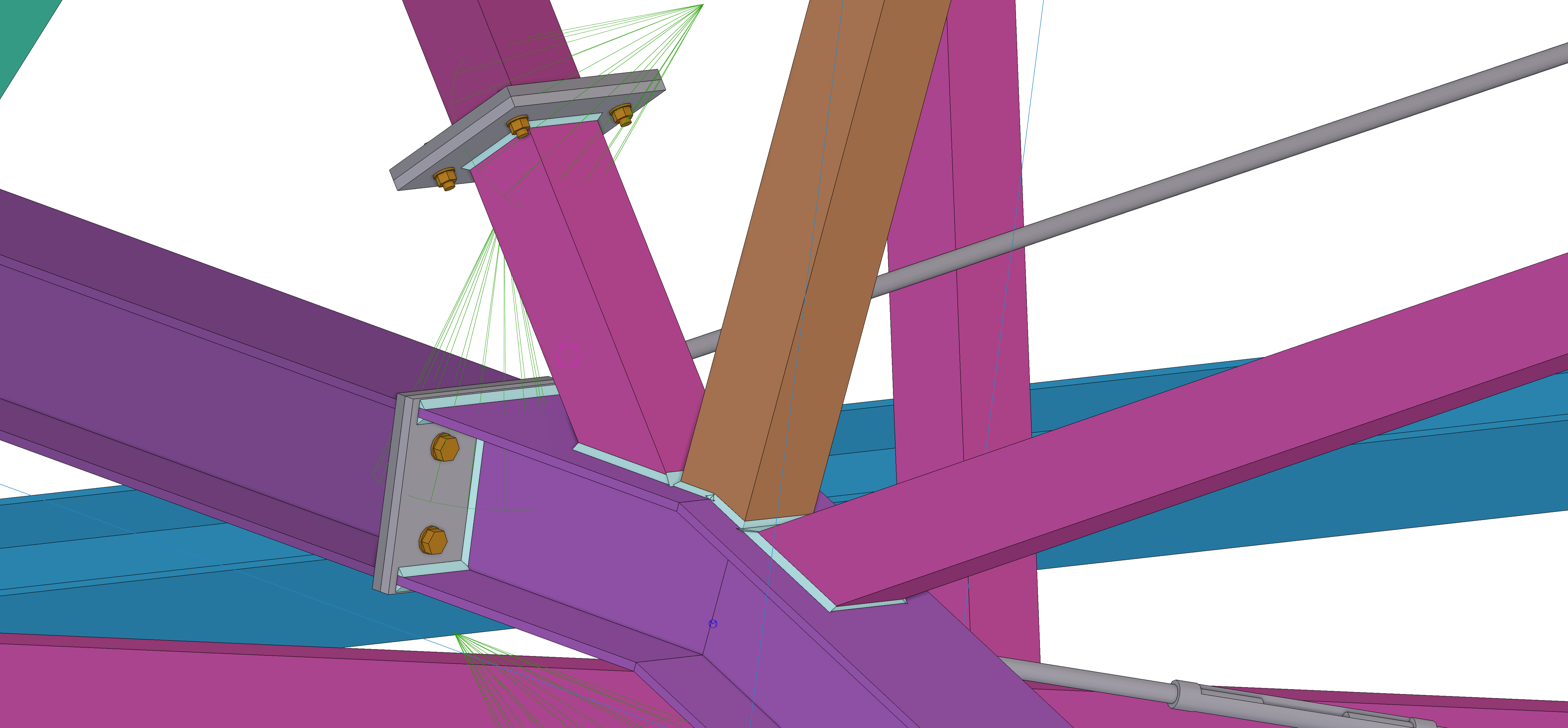 Do pomocy w wyznaczeniu sił wewnętrznych, niezbędnych do wymiarowania konstrukcji wykorzystano program do analizy statyczno-wytrzymałościowej RFEM 6. Dodatkowo przeprowadzono szczegółową analizę oddziaływania wiatru na bryłę hangaru za pomocą dodatkowego modułu RWIND wykorzystującego symulację umieszczenia budowli w tunelu aerodynamicznym. Na podstawie otrzymanych sił wewnętrznych oraz najbardziej niekorzystnej sytuacji obliczeniowej dokonano wymiarowania głównych elementów hangaru oraz zaprojektowano i zweryfikowano nośności połączeń stalowych. Wszystkie wymagane warunki ze względu stany graniczne nośności – SGN i użytkowalności – SGU zostały spełnione dla wszystkich elementów konstrukcyjnych jak i połączeń. Dodatkowo został wykonany szczegółowy model 3D konstrukcji hangaru w oprogramowaniu do modelowania konstrukcji budowlanych – Tekli Structures, ukazujący wszystkie zaprojekowane elementy, połączenia oraz ogólną bryłę budynku 3D. Wszystkie procedury obliczeniowe zostały przeprowadzone w ramach aktualnie obowiązujących norm projektowych, czyli Eurokodów. Do pracy załączono również dokumentację rysunkową w postaci rysunki konstrukcyjnych zespołów wysyłkowych, a także ogólnych rysunków zestawczych konstrukcji wraz z niezbędnymi wymiarami montażowymi oraz przekrojami.