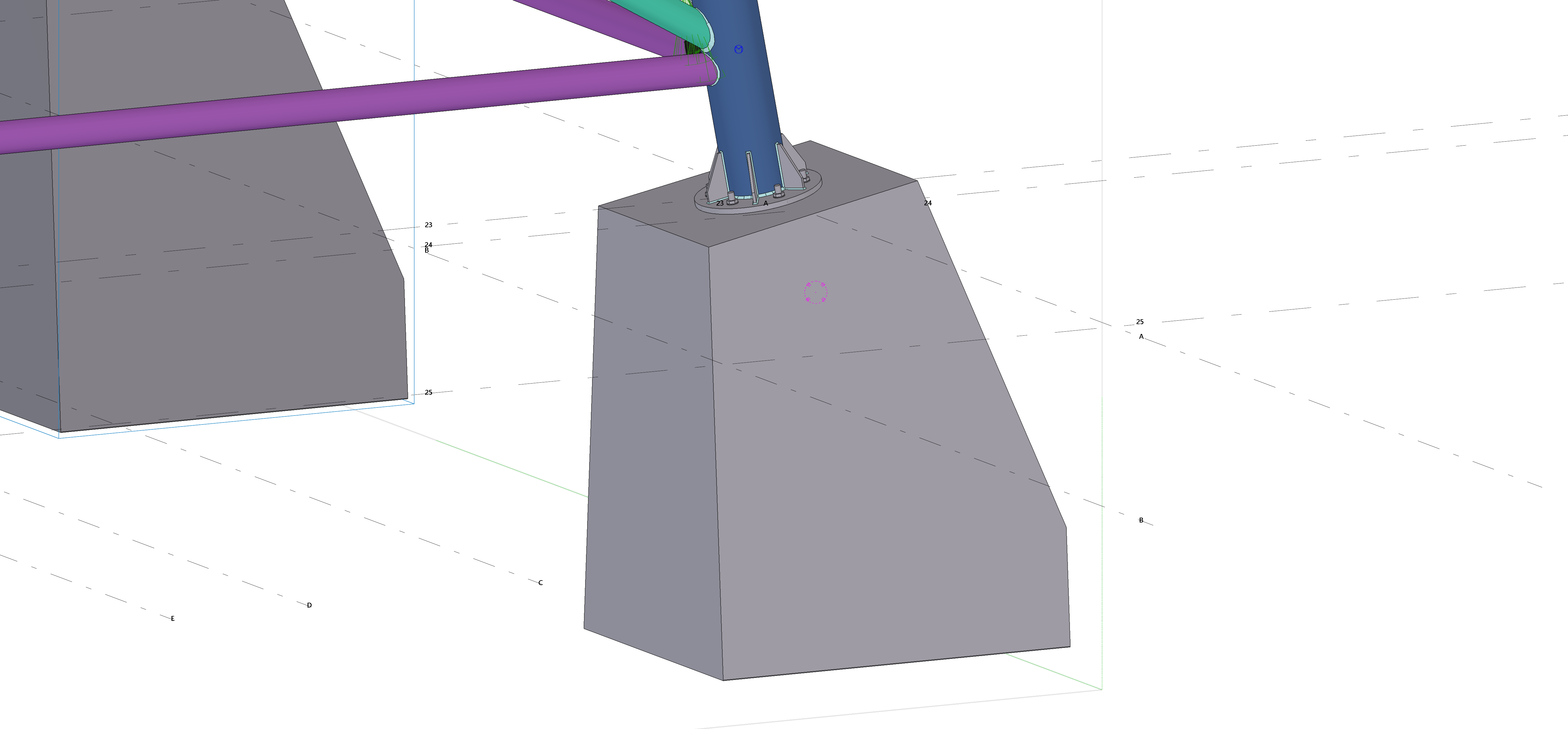 Głównym układem nośnym konstrukcji jest dwuczęściowa rama kratownicowa. Dolna część konstrukcji nazywana „kozłem” składa się z okrągłych kształtowników rurowych CHS273,0x12,5 oraz belki w postaci kształtownika HEA280, na której opierać się będzie górna kratownica łukowa. Jest ona złożona z pasów dolnych wykonanych z kształtownika HEA200, pasów górnych wykonanych z kształtownika HEB220, natomiast krzyżulce i słupki z rur kwadratowych o przekroju SHS100x4,5 oraz SHS100x6,3. Górna kratownica łukowa podzielona jest na 8 niezależnych segmentów połączonych ze sobą doczołowo. Dochodzące do niej belki płatwiowe (kształtowniki HEA140) połączone są z układami poprzecznymi przegubowo za pomocą blachy. Słupy nośne konstrukcji połączono ze stopami fundamentowymi w sposób przegubowy.