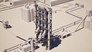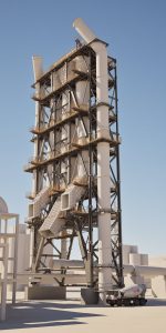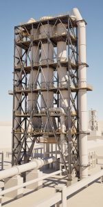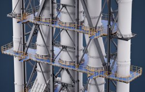 Przedmiotem opracowania były obliczenia węzłów oraz wykonanie szczegółowego modelu 3D stalowej konstrukcji wsporczej wieży, wraz z pełną dokumentacją warsztatową i montażową. Zaprojektowana wieża stanowi podporę dla nowo projektowanych kanałów powietrza oraz dwóch kanałów gorącego gazu. Słupy w rozstawie 22×8,5m oparto na nowo projektowanych ścianach betonowych.