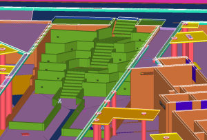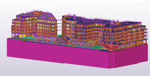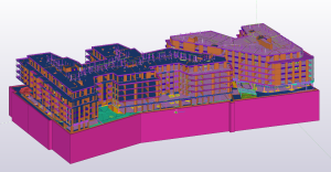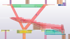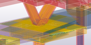 Building B, due to its dimensions, will be divided into expansion sections – implemented as a structural duplication at the joints – in order to minimize shrinkage effects. In the aparthotel section of Building B, in gridlines 13’-16/K-H, a cantilevered part of the structure has been designed, supported by a V-shaped column with an irregular geometry and variable cross-section.