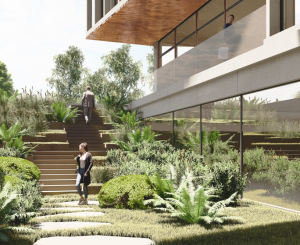 An interesting architectural feature is the monolithic reinforced concrete arched slab in the form of a “wave”, as well as the monolithic reinforced concrete “wave” staircase, which partially serves as the ceiling over the commercial area. The wave-shaped staircase will function as a public space intended for gatherings. Seating and landscaping elements have been designed on the steps.