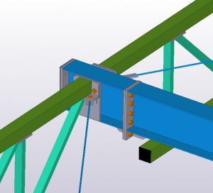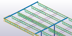Workshop project of the steel structure of canopy over the entrance gates to the industrial hall in Biskupice Podgórne, near Wrocław. The canopy is used to protect lithium-ion batteries against atmospheric agents during loading onto trucks. The canopy is located on one of the sides of the warehouse hall, which is part of the LG CHEM hall complex. The structure has dimensions of 17.7×66.6m in plan, which gives an area of over 1150m2. The structure consists of girders on which truss purlins are supported. The whole canopy is supported on steel columns and mounted to the sides of the hall. The model also includes the substructure for facade panels.