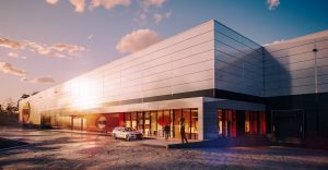 The facility comprises warehouse space, a social and office area, and a connector linking the new hall to the existing plant buildings. The building’s form is characterized by a modern, minimalist design that blends harmoniously with the surrounding development.