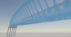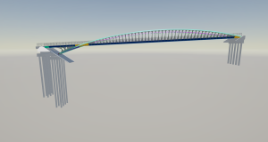 Az acél szerkezetű híd változatok anyagfelhasználását, esztétikáját, statikai és dinamikai viselkedését paraméteres Grasshopperben felépített modelleken vizsgáltuk. A kiválasztott változat egy háromtámaszú, íves főtartójú, acél felszerkezetű híd. A híd megjelenésében igyekszik kihasználni az áthidalt akadály által meghatározott aszimmetriát, melynek különlegessége az 56 fokban kifelé döntött íves főtartók háromszög keresztmetszetűek, ezek függesztik fel a pályaszerkezet iker merevítőtartóját. A híd felsőpályás szerkezetként indul, majd a 2-es támasz környezetében vált alsópályássá.