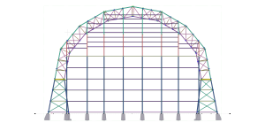 Głównym układem nośnym konstrukcji jest dwuczęściowa rama kratownicowa. Dolna część konstrukcji nazywana „kozłem” składa się z okrągłych kształtowników rurowych CHS273,0x12,5 oraz belki w postaci kształtownika HEA280, na której opierać się będzie górna kratownica łukowa. Jest ona złożona z pasów dolnych wykonanych z kształtownika HEA200, pasów górnych wykonanych z kształtownika HEB220, natomiast krzyżulce i słupki z rur kwadratowych o przekroju SHS100x4,5 oraz SHS100x6,3. Górna kratownica łukowa podzielona jest na 8 niezależnych segmentów połączonych ze sobą doczołowo. Dochodzące do niej belki płatwiowe (kształtowniki HEA140) połączone są z układami poprzecznymi przegubowo za pomocą blachy. Słupy nośne konstrukcji połączono ze stopami fundamentowymi w sposób przegubowy.