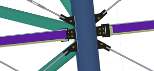 Do pomocy w wyznaczeniu sił wewnętrznych, niezbędnych do wymiarowania konstrukcji wykorzystano program do analizy statyczno-wytrzymałościowej RFEM 6. Dodatkowo przeprowadzono szczegółową analizę oddziaływania wiatru na bryłę hangaru za pomocą dodatkowego modułu RWIND wykorzystującego symulację umieszczenia budowli w tunelu aerodynamicznym. Na podstawie otrzymanych sił wewnętrznych oraz najbardziej niekorzystnej sytuacji obliczeniowej dokonano wymiarowania głównych elementów hangaru oraz zaprojektowano i zweryfikowano nośności połączeń stalowych. Wszystkie wymagane warunki ze względu stany graniczne nośności – SGN i użytkowalności – SGU zostały spełnione dla wszystkich elementów konstrukcyjnych jak i połączeń. Dodatkowo został wykonany szczegółowy model 3D konstrukcji hangaru w oprogramowaniu do modelowania konstrukcji budowlanych – Tekli Structures, ukazujący wszystkie zaprojekowane elementy, połączenia oraz ogólną bryłę budynku 3D. Wszystkie procedury obliczeniowe zostały przeprowadzone w ramach aktualnie obowiązujących norm projektowych, czyli Eurokodów. Do pracy załączono również dokumentację rysunkową w postaci rysunki konstrukcyjnych zespołów wysyłkowych, a także ogólnych rysunków zestawczych konstrukcji wraz z niezbędnymi wymiarami montażowymi oraz przekrojami.