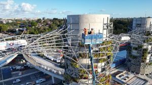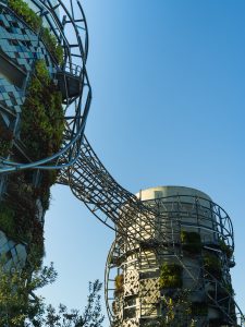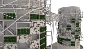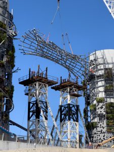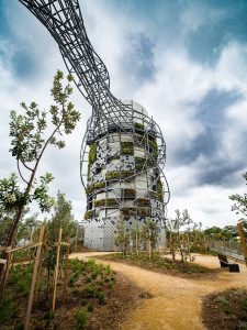 Vine-like elements twist and weave around the structure adding to the architectural intent, while being crucial to the global stability of bridging elements and holistic performance of the structure.