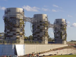 The work re-frames the monolithic vehicle exhaust vents; three reinforced concrete chimneys with diameters of 9.8 m, 12.3 m and 13.8 m and heights of 40 m, 41 m and 42 m. Looking to site history and its continued stories, from vast ecosystems to industrial and transport use, Studio Chris Fox designed an steel structural adornment, to envelop, transform and soften their form. Derived patterns of sculptural movement, looping and interweaving provide a framework for nature to take over.