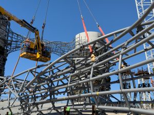 The interstitial space between the concrete and the framing allows for manual maintenance of the concrete outlet with air monitoring and sampling ports that are located at elevated sampling platforms. The platform structures (at a height of 33m) surround each outlet with stairs and are utilised in combination with beams in laterally pinning the structure to the outlets.