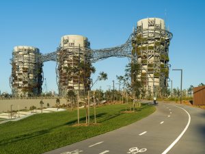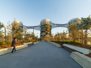 This project, as a landmark urban artwork interweaves between ventilation towers servicing an underground motorway as part of Sydney’s WestConnex project. Freeing space for public use, the project takes ground within a new recreational parkland on the edge of Rozelle Bay.