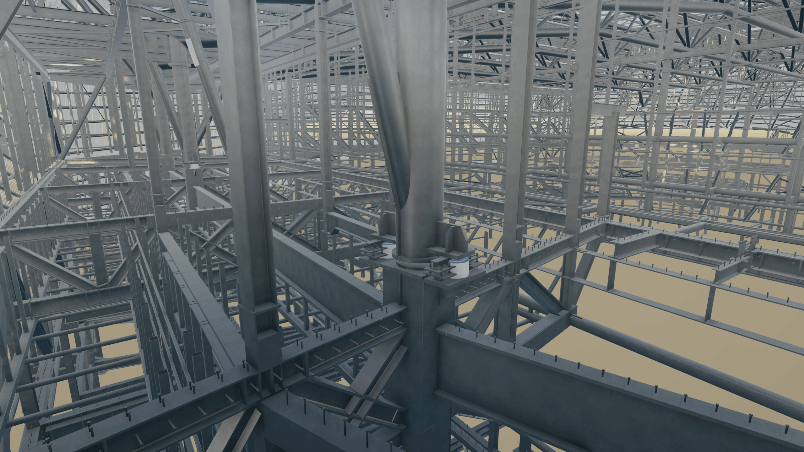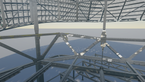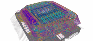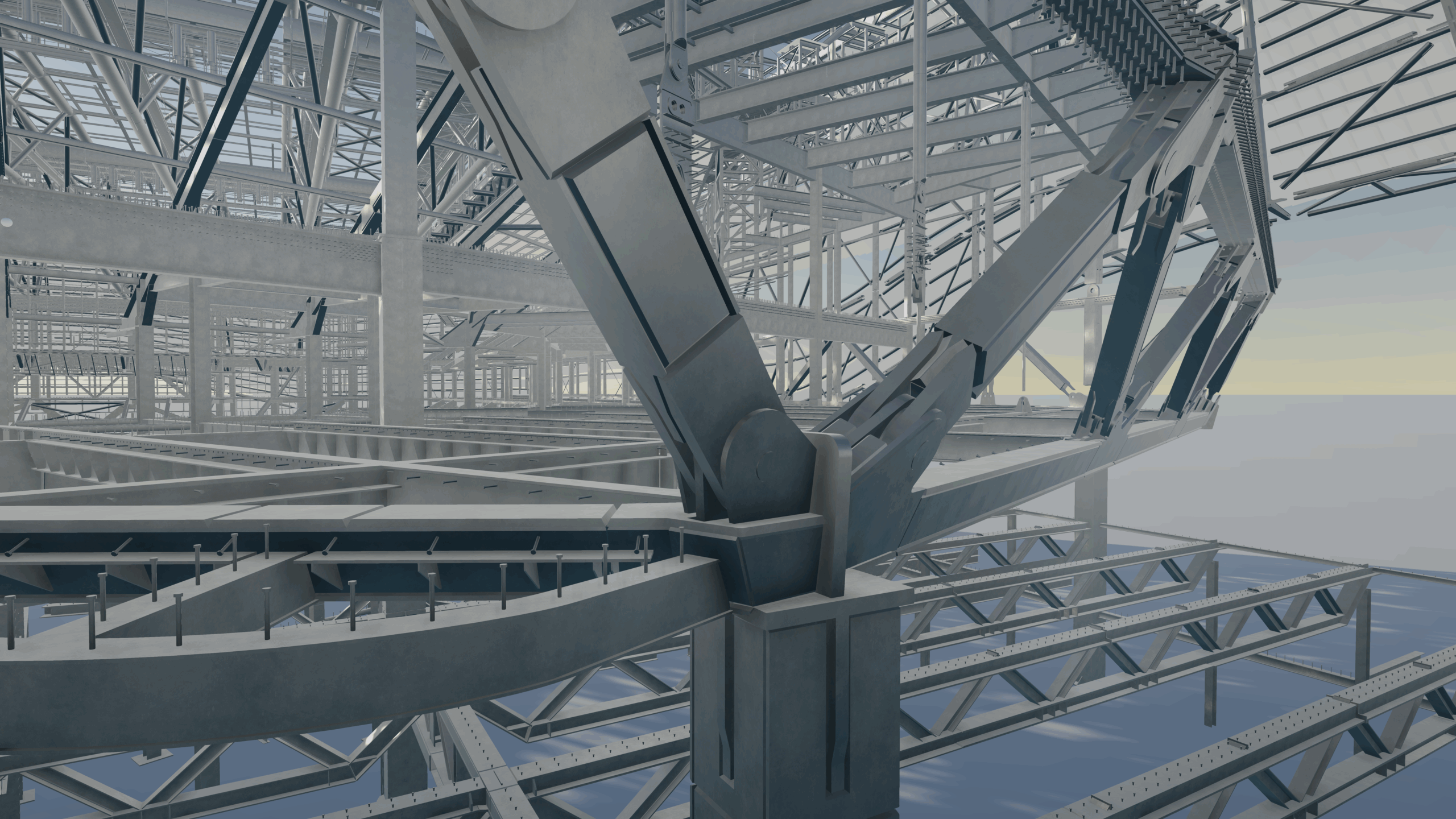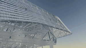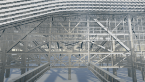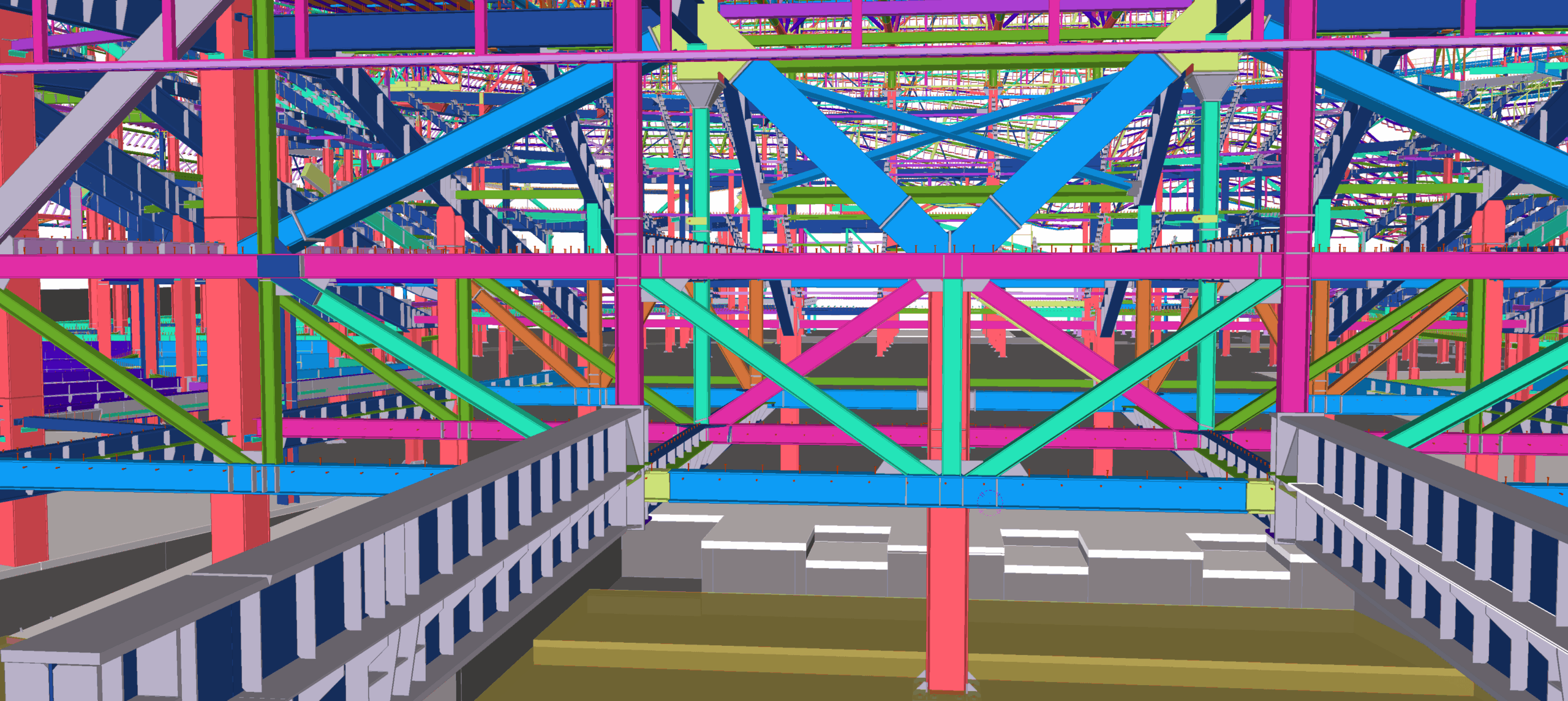 3. La Cubierta: La Cubierta es otra de las partes principales del Arena. Dada la necesidad de albergar la mayor parte de las instalaciones MEP (Mecánicas, Eléctricas y de Fontanería) y conducciones, la estructura de cubierta se diseñó para ser rígida y espaciosa, permitiendo numerosos puntos de izado de cargas. El diseño específico consiste en 8 cerchas este-oeste tipo Warren de sección transversal triangular. Estas cerchas tienen aproximadamente 120 m de longitud y 8 m de canto (medido en proyección vertical). Las cerchas están simplemente apoyadas en el edificio, lo que proporciona un carácter isostático al conjunto y una transmisión de cargas al edificio directa y bien definida. Los equipos MEP se concentran en dos terrazas en los lados norte y sur de la cubierta, y se omiten las cerchas en la primera y última posición en estas áreas para crear espacio para las máquinas y conducciones. La unidireccionalidad y magnitud de las cerchas buscan destacar la cubierta en el conjunto del edificio.