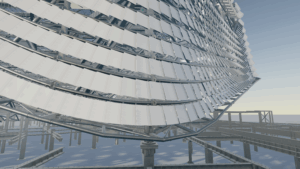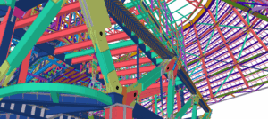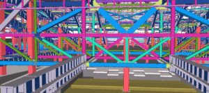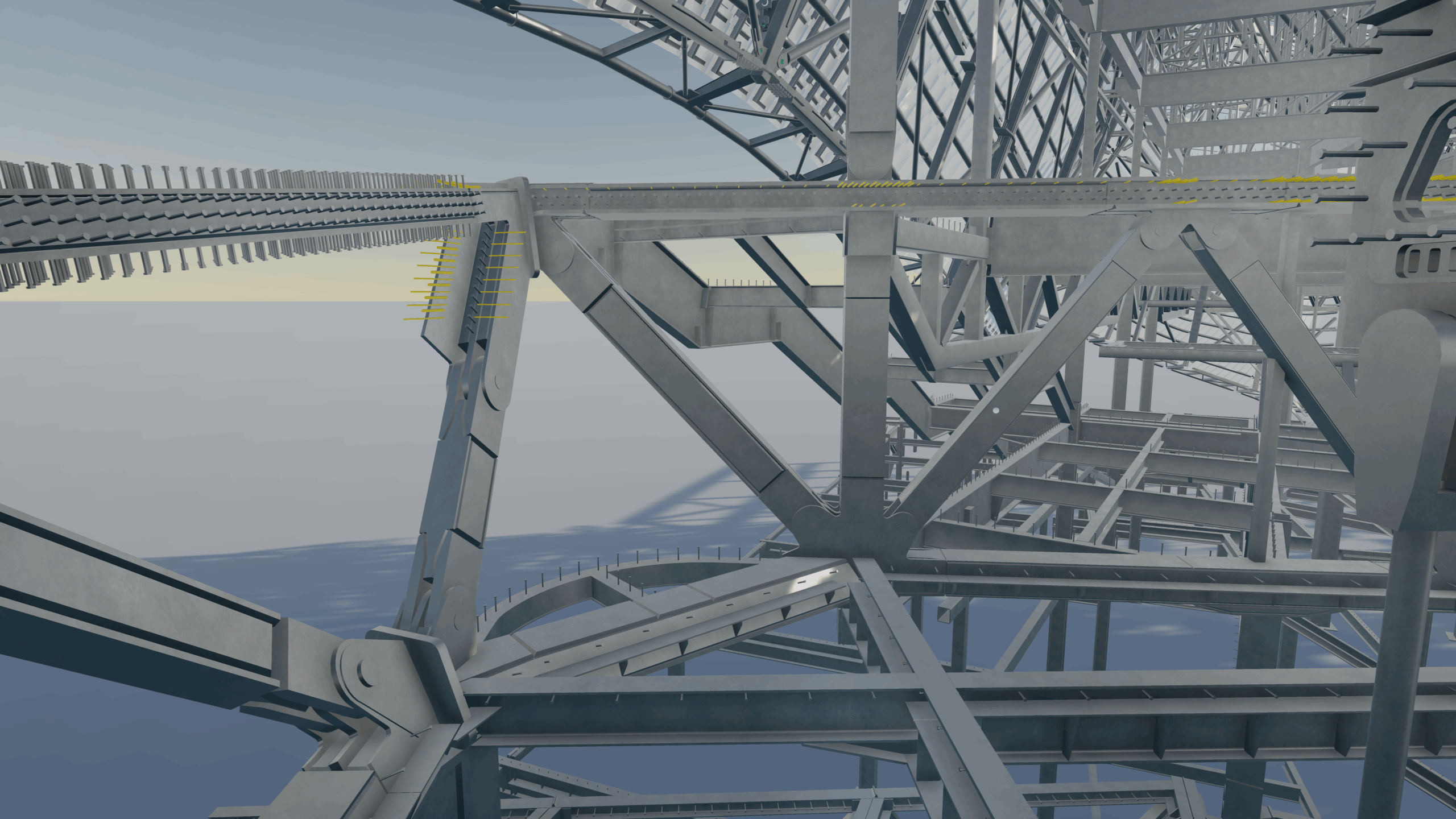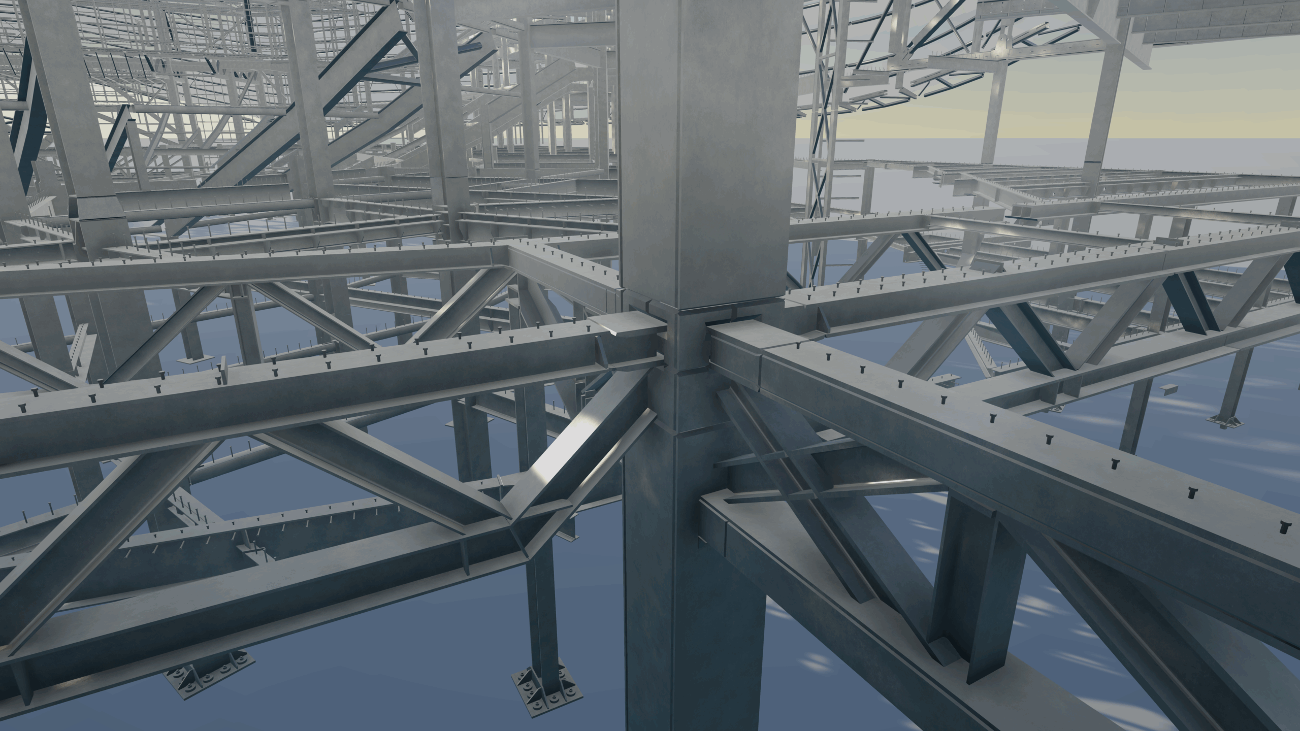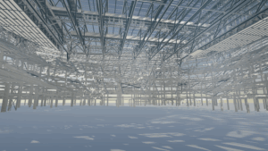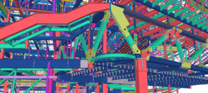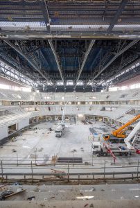 3. La Cubierta: La Cubierta es otra de las partes principales del Arena. Dada la necesidad de albergar la mayor parte de las instalaciones MEP (Mecánicas, Eléctricas y de Fontanería) y conducciones, la estructura de cubierta se diseñó para ser rígida y espaciosa, permitiendo numerosos puntos de izado de cargas. El diseño específico consiste en 8 cerchas este-oeste tipo Warren de sección transversal triangular. Estas cerchas tienen aproximadamente 120 m de longitud y 8 m de canto (medido en proyección vertical). Las cerchas están simplemente apoyadas en el edificio, lo que proporciona un carácter isostático al conjunto y una transmisión de cargas al edificio directa y bien definida. Los equipos MEP se concentran en dos terrazas en los lados norte y sur de la cubierta, y se omiten las cerchas en la primera y última posición en estas áreas para crear espacio para las máquinas y conducciones. La unidireccionalidad y magnitud de las cerchas buscan destacar la cubierta en el conjunto del edificio.