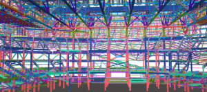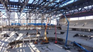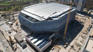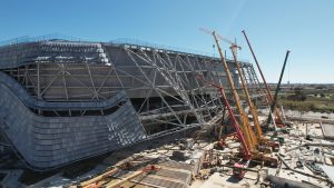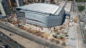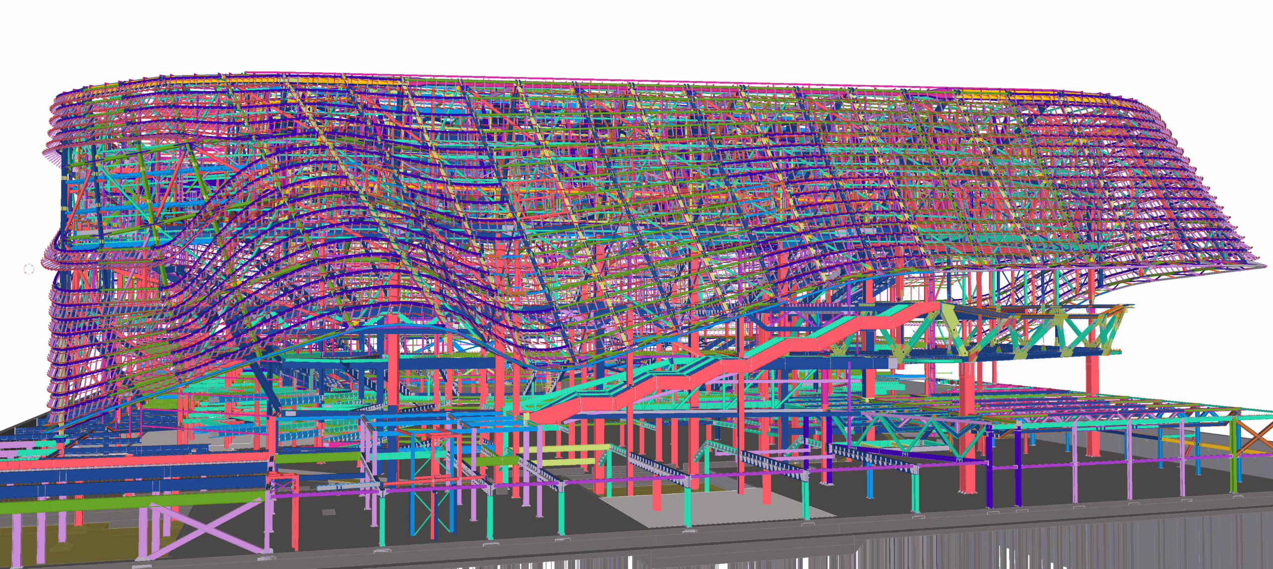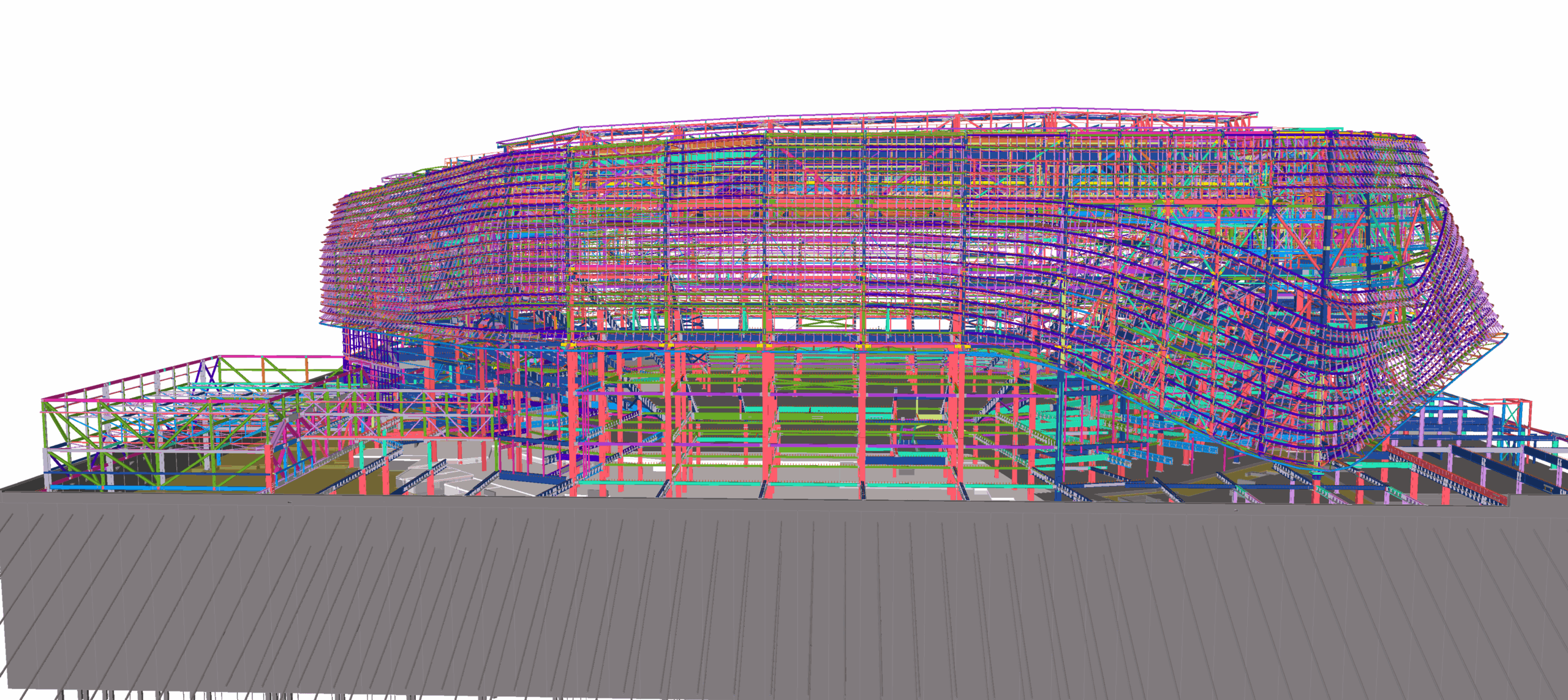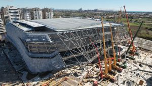 1. The Building (or Main Building / Graderío): The Main Building, known as the Graderío, is the central space of the complex, designed primarily to host sporting, musical and cultural events. It is distributed over 6 main levels. The main structure of the grandstand building is mainly composed of structural steel frames. These frames are made up of columns, beams (reinforced beams and rolled profiles) and raker beams, on which the prefabricated bleachers are supported. In addition, four vertical reinforced concrete communication cores have been designed at the corners of the building. The slabs of the building are resolved with different structural typologies depending on the conditions, the predominant one being prefabricated concrete slabs with hollow core slabs with a compression layer. Other typologies used include solid concrete slabs, post-tensioned lightened slabs and composite slabs. The building also integrates other specific areas such as the Multifunctional Hall, the Auxiliary Basketball Court, the Loading Dock and the Terraces (“Fueras”).