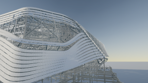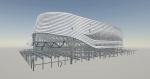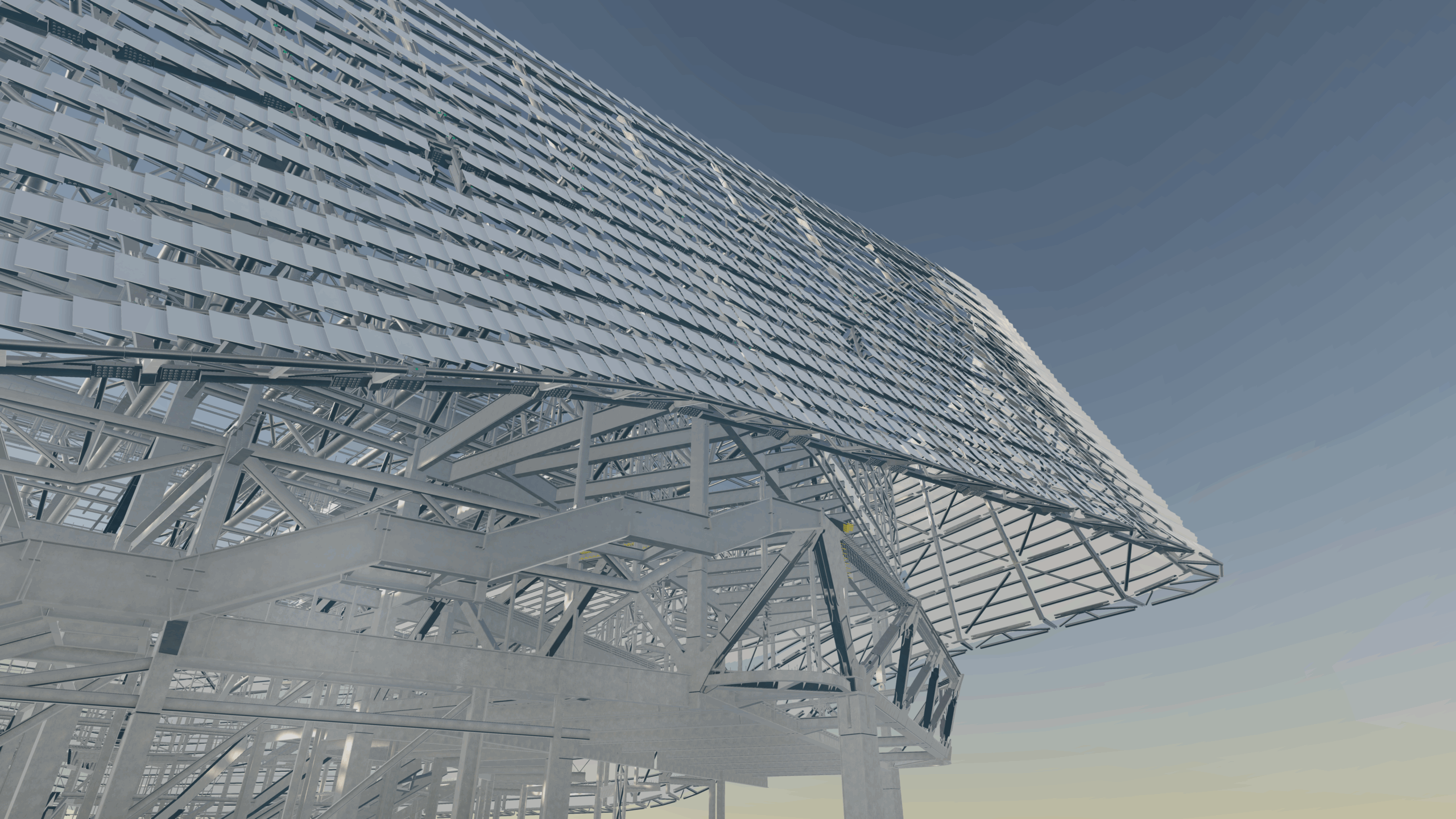 2. The Façade: The Façade is one of the main parts of the Arena. Structurally, it is composed of vertical mullions that act as the main load-bearing elements. These uprights are connected to the building and the roof in different ways depending on the side. On the east and west sides, the façade is suspended from the roof, transferring its loads to the roof. The uprights are connected to the roof and the building by means of horizontal struts against horizontal loads. The external architectural envelope consists of a series of structural steel tubes surrounding the building to which the façade louvres are bolted. These structural tubes are generally connected to the vertical mullions of the façade by means of a “hanger” system.