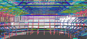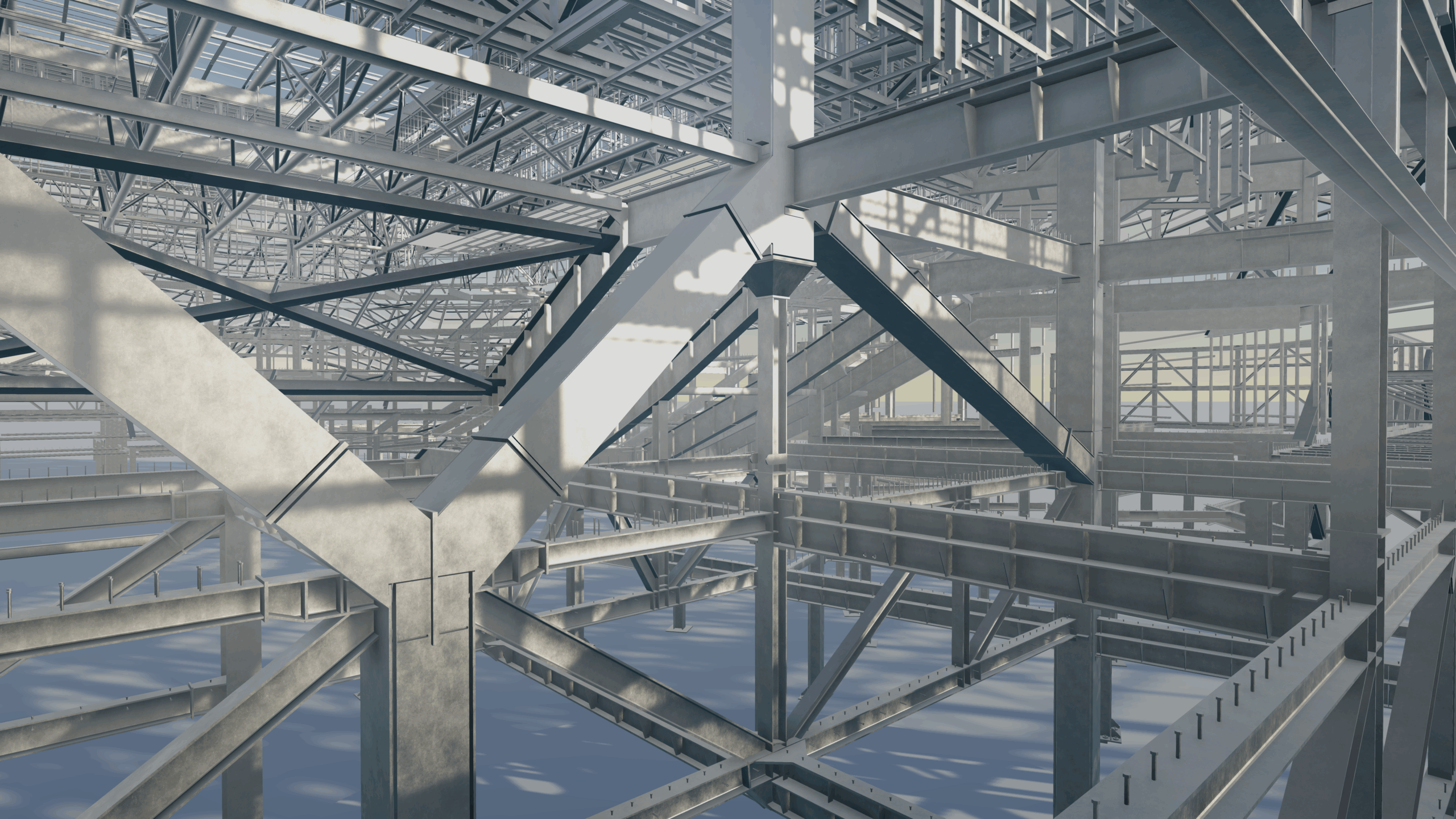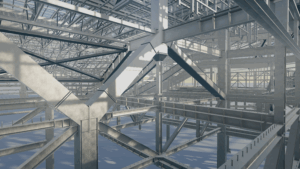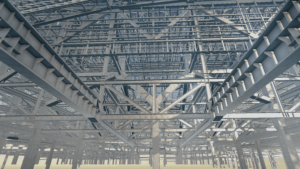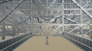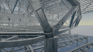3. The Roof: The roof is another major part of the Arena. Given the need to house most of the MEP (Mechanical, Electrical and Plumbing) installations and ducting, the roof structure was designed to be rigid and spacious, allowing for numerous load lifting points. The specific design consists of 8 east-west Warren trusses of triangular cross section. These trusses are approximately 120 m long and 8 m high (measured in vertical projection). The trusses are simply supported on the building, which provides an isostatic character to the assembly and a direct and well-defined load transmission to the building. The MEP equipment is concentrated on two terraces on the north and south sides of the roof, and the trusses are omitted in the first and last positions in these areas to create space for machines and ducting. The unidirectionality and magnitude of the trusses seek to highlight the roof in the building as a whole.