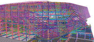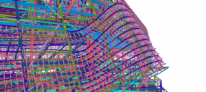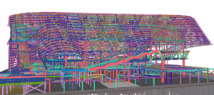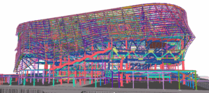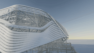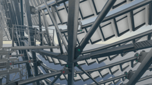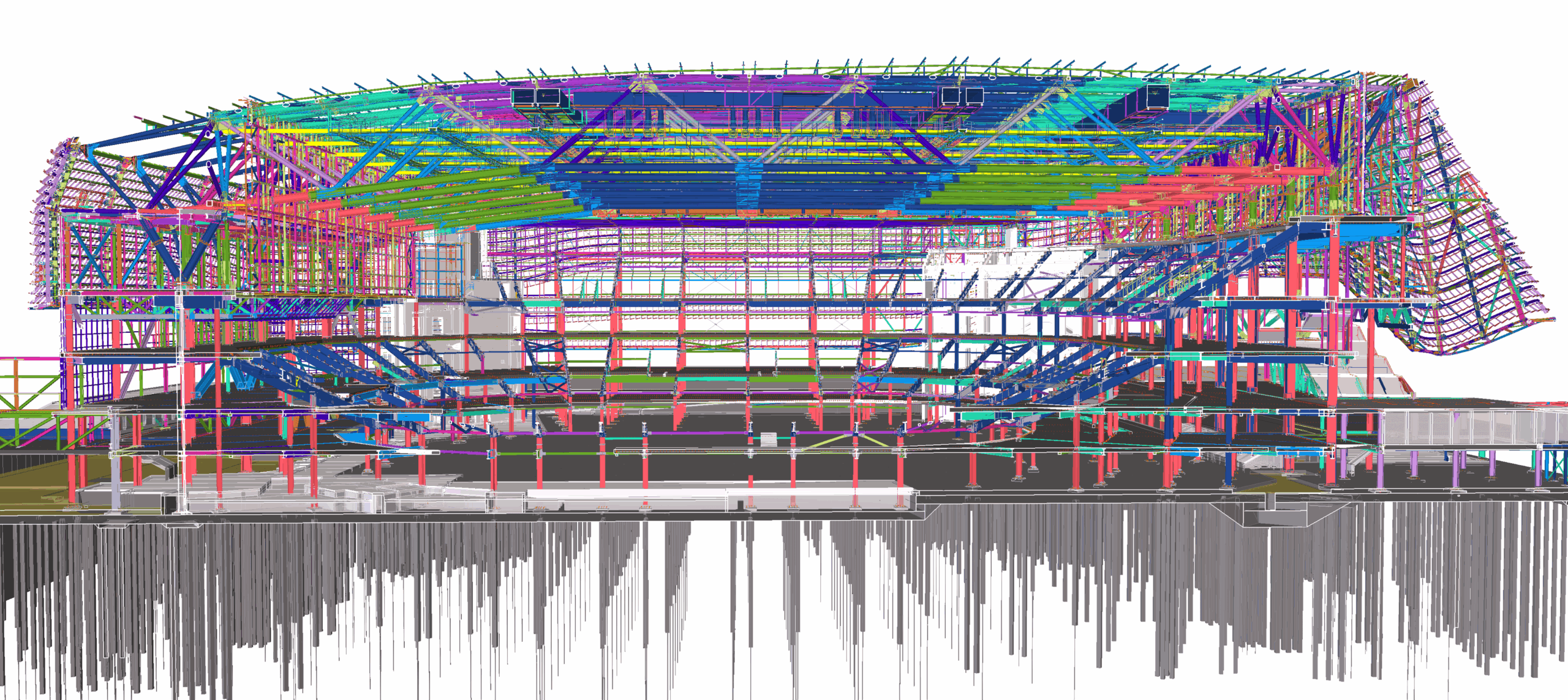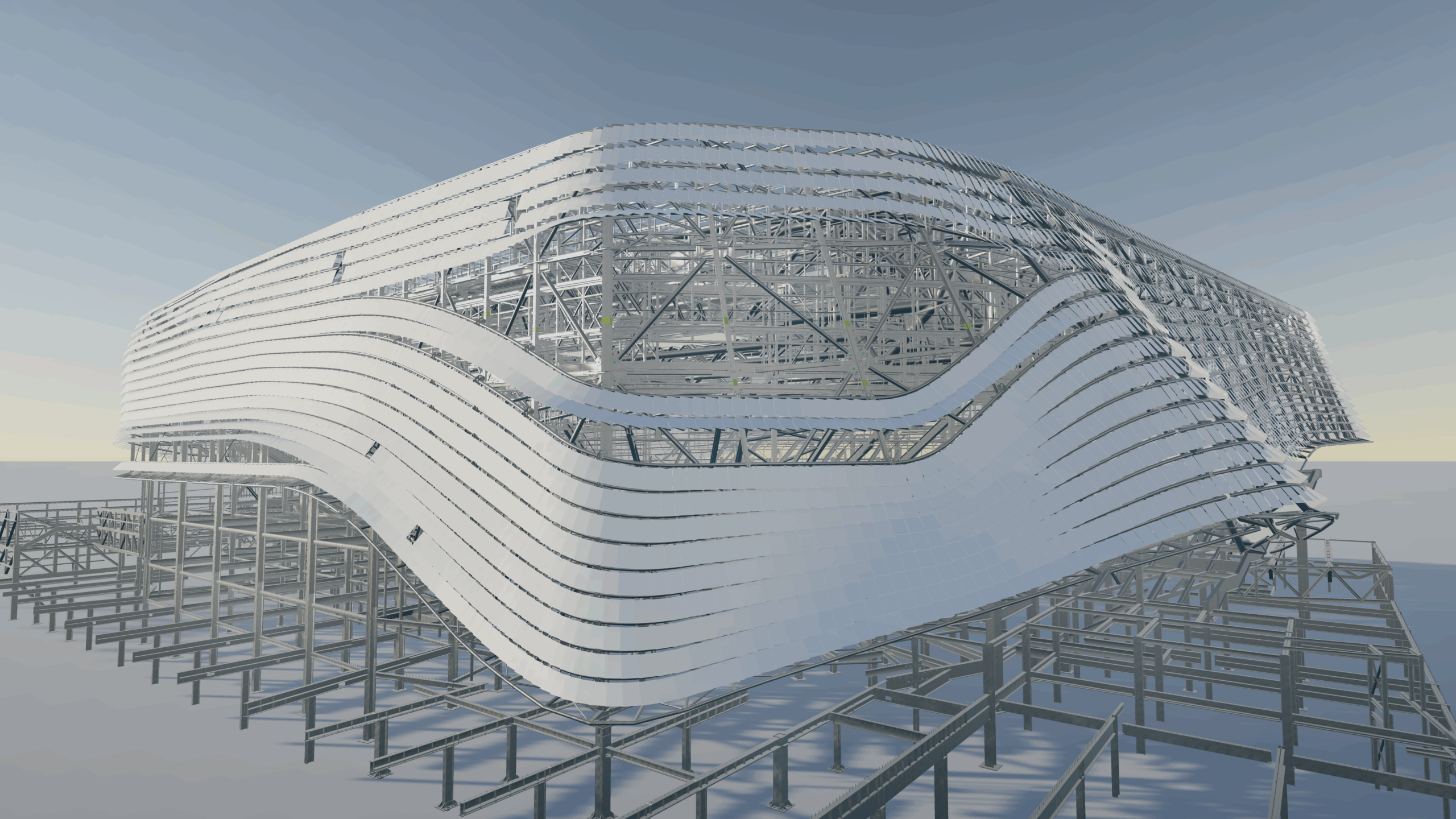 2. La Fachada: La Fachada es una de las partes principales del Arena. Desde el punto de vista estructural, está compuesta por montantes verticales que actúan como elementos portantes principales. Estos montantes se conectan al edificio y a la cubierta de manera diferente según el lado. En los lados este y oeste, la fachada se cuelga de la cubierta, transfiriendo sus cargas a ella. Frente a cargas horizontales, los montantes se conectan a la cubierta y al edificio mediante puntales horizontales. La envolvente arquitectónica exterior consiste en una serie de tubos de acero estructural que rodean el edificio y a los que se atornillan las lamas de fachada. Estos tubos estructurales se conectan generalmente a los montantes verticales de la fachada mediante un sistema de “perchas”.