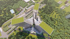 Het model is gemaakt voor de HBO-batchelor minor Creatief construeren, gegeven op de Hogeschool van Arnhem en Nijmegen in Arnhem. In deze minor worden studenten aangemoedigd om een constructief uitdagend ontwerp te maken en uit te werken. Het project bevatte drie identieke kantoorgebouwen met een helling van 20 graden vanaf de 9e verdieping. De gebouwen hebben een hoogte van 24 verdiepingen, dat is totaal 86,4 meter. De drie gebouwen zijn verbonden met lange vrijdragende bruggen welke aansluiten op de 4e, 8e, 12e, 16e en 20e verdieping. In het midden van de drie gebouwde gebouwen bevindt zich een pyloon waarvan het hoogste punt zich op een adembenemende 100 meter begeeft. Alle hoofddraagconstructies, met uitzondering van de vloeren en de fundering, zijn gemaakt van een stalen vakwerkconstructie. De constructieve uitdaging was om zo min mogelijk staal te gebruiken, terwijl de stabiliteit en stijfheid van de constructie in veilige omstandigheden gehandhaafd blijven. Verbindingen tussen de gebouwen, bruggen en de pyloon moesten zorgvuldig worden ontworpen vanwege de verschillen tussen globale stijfheden. Een andere uitdaging was om te ontwerpen met de meest betrouwbare oplegvoorwaarde. Ook was de tijd die we hadden een grote uitdaging. Het ontwerp moest binnen enkele maanden worden voltooid, dus de druk om te presteren was erg hoog. Het model gaf nieuwe inzichten over complexe detailleringen. Dit resulteerde in een versnelling van het engineeringproces en maakte het mogelijk om een ontwerp met minder fouten te maken. Nadat de constructie ontworpen was, werd het model gebruikt om een aantal fotorealistische renders en een video te maken die de presentatie tot een spectaculaire aangelegenheid maakte. Ook de mogelijkheid om het model in virtuele realiteit te bekijken, was voor leraren en studenten verbluffend. De interactie werd gemaakt met een FEM-rekensoftware genaamd RFEM. De vertaling is in beide richtingen gemaakt om daarmee het globale constructieve ontwerp sneller en beter te ontwerpen.