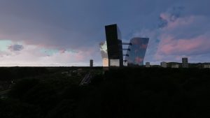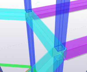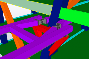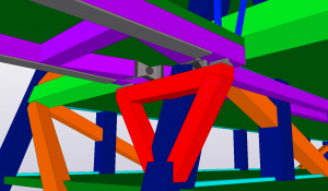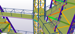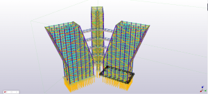 The model was made for the HBO batchelor minor Creative structual engineering, given at the Hogeschool van Arnhem en Nijmegen in Arnhem. In this minor students are encouraged to design and engineer a constructive engineering challenge. The project contained three identical buildings with a tilt of 20 degrees starting at the 9th floor. The buildings have a height of 24 floors, thats up to 86,4 meters. The three buildings are connected with long unsupported bridges at the 4th, 8th, 12th, 16th and the 20th floor. In the centre of the three tilded builings is located a pylon is raising up to 100 meters in to the sky. All bearing construction except for the floors and the foundations are made of steel framework. The structural challenge was to use as less as possible steel, while stability and stiffness of the structure maintains in safe conditions. Connections between the buildings, bridges and the pylon had to be carefully designed because of the differences between global stiffnesses. Another challenge was to desing with the most reliable impositions. As was the time we had. The design had to be finished in several months, so the pressure to perform was very high. The model gave new insights to complex detailing. This resulted in speeding up the engineering process and made it possible to make a design with less errors. After the structure was designed, the model was used to make some photorealistic images and a video which made the presentation a spectaculair exibition. Also the possibility to view the model in virtual reality was mind blowing for teachers and students. The interaction was made with FEM software pakkage RFEM. The translation was made both ways.