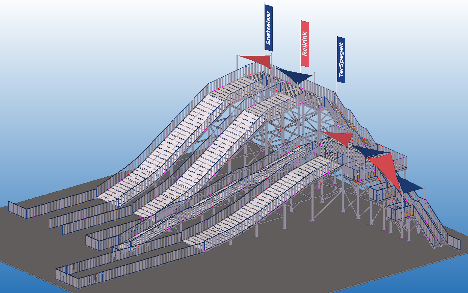 For Reijrink Staalconstructie, we had the pleasure of developing a particularly fun steel structure for production and assembly. At Recreatiepark TerSpegelt in Eersel, visitors can now jump and slide from various heights on the 10-meter-high TubbyJump, ending in a spectacular launch onto a large air cushion.