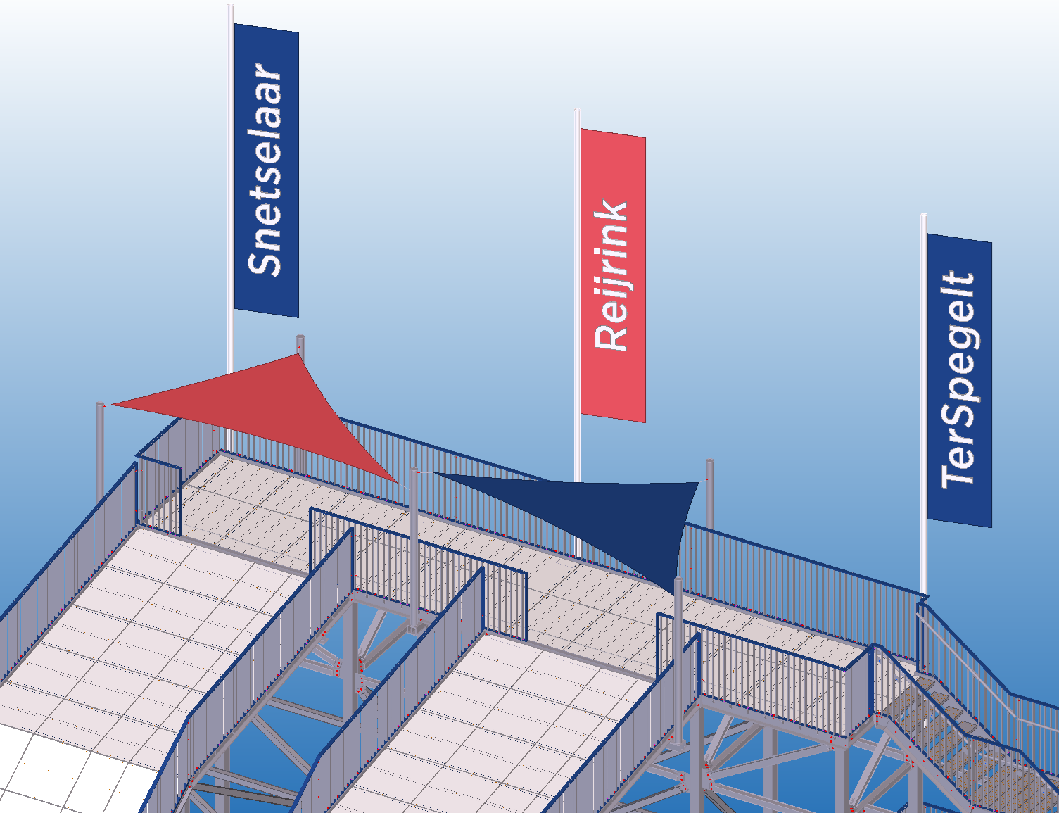The main structure consists of a thermally galvanized box frame with bent U-profiles serving as a substructure for the plastic panels. The railings were also made from thermally galvanized box profiles. Stainless steel handrails were installed along the stairs. Sustainability was a key consideration in making these choices. Furthermore, all hardware and locking mechanisms for the various swing gates were included in the BIM model.