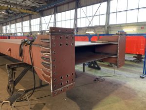 The steel construction of approx. 2,000 tons consists of steel plate columns and rectangular girders made of steel plates. The heaviest fixed columns are fabricated with steel plates with dimensions 3m x 0.5m x 27.8m. All connections are made in such a way that deformations due to hole clearance are prevented (for dynamic behaviour of the crane).