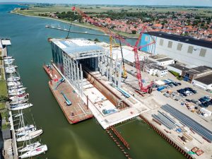 The second dock hall at Strânwei 6 in Makkum for Royal De Vries Shipbuilding has a length of approx. 125 m, height of approx. 28 m, and width of approx. 37 m. Commissioned by Staalbouw Nagelhout Bakhuizen BV and by Jorritsma Bouw BV Bolsward, to a design by Alynia Architecten BV Harlingen and constructed by Ingenieursbureau Boorsma, KTN Engineering BV carried out the engineering for the complete steel construction.
