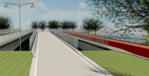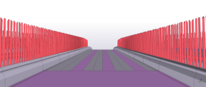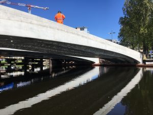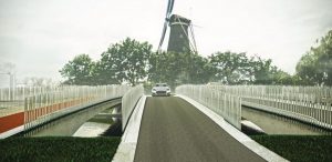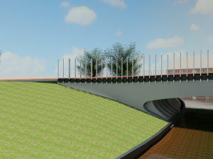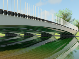 The bridge has been designed by NEY & Partners and consists of four bridges with a span of over 30 meters. The four bridges merge together at the south side. The bottom of the bridge has been designed to be a variation of two different concrete beams that vary in profile. This accentuates the space underneath the bridges and gives it a very special feeling. In this way the architect emphasises the importance of water for the city of Leiden. To keep the bridge as slender as possible, the bridge is constructed as an integral bridge en will be integrally linked with its abutments and piles. In addition to that there will be no visible seams and the bridge will blend into the surrounding terrain. The railing is constructed out of casted aluminium and will be connected to the bridge with steel plates. Because the railing is slightly bended and the uprights can be placed in eight different orientations, the bridge will look like it is surrounded by a curtain of reeds.