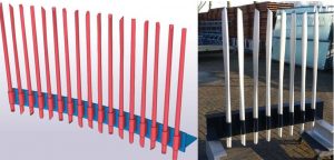 De leuningstijlen zijn vervaardigd uit gegoten aluminium en worden met een metalen randplaat aan de brug bevestigd. Door de vorm van de stijlen, die iets gebogen zijn en in 8 verschillende richtingen worden bevestigd, wordt de brug als het ware door een rietrand omzoomd.